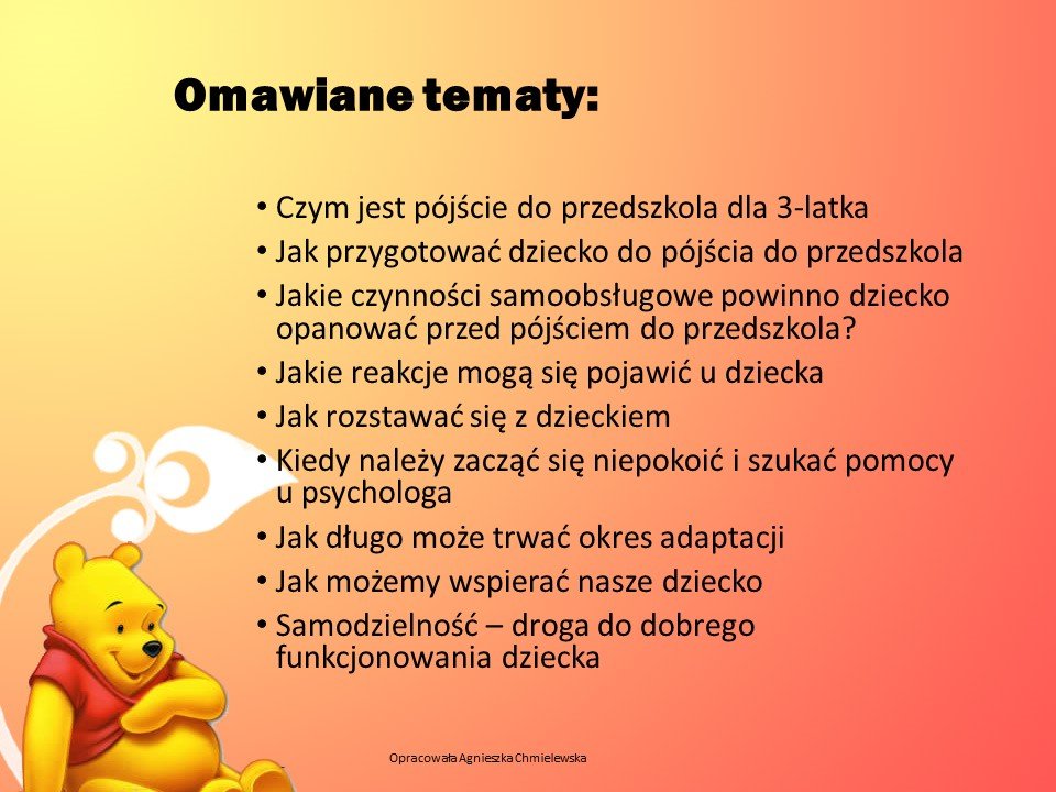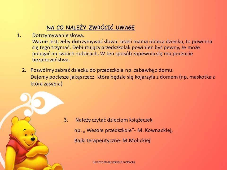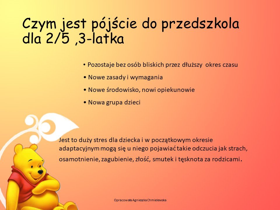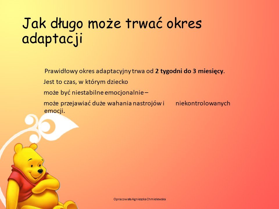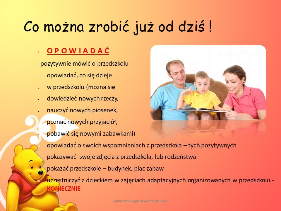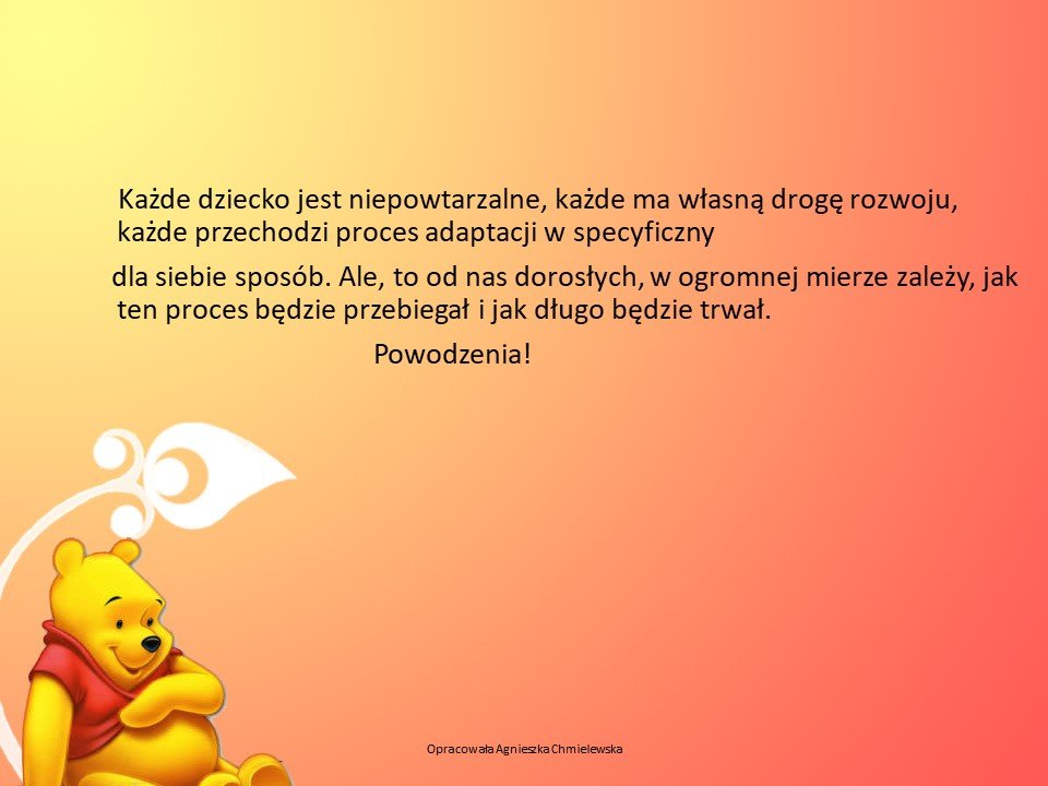 Adaptacja dla dzieci nowo przyjętych do naszego Przedszkola jest w ostatnim tygodniu sierpnia. Szczegółowy plan spotkań zostaje umieszczany w lipcu w danym roku szkolnym.